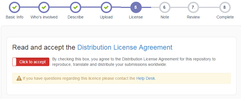 If you uploaded at least one file, you must select a license under which you want your resources to be distributed in this step (data without license is unusable because a user does not know how can he/she use it!). Please read the Distribution agreement carefully and click the red box to indicate your agreement (it will turn green).