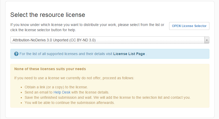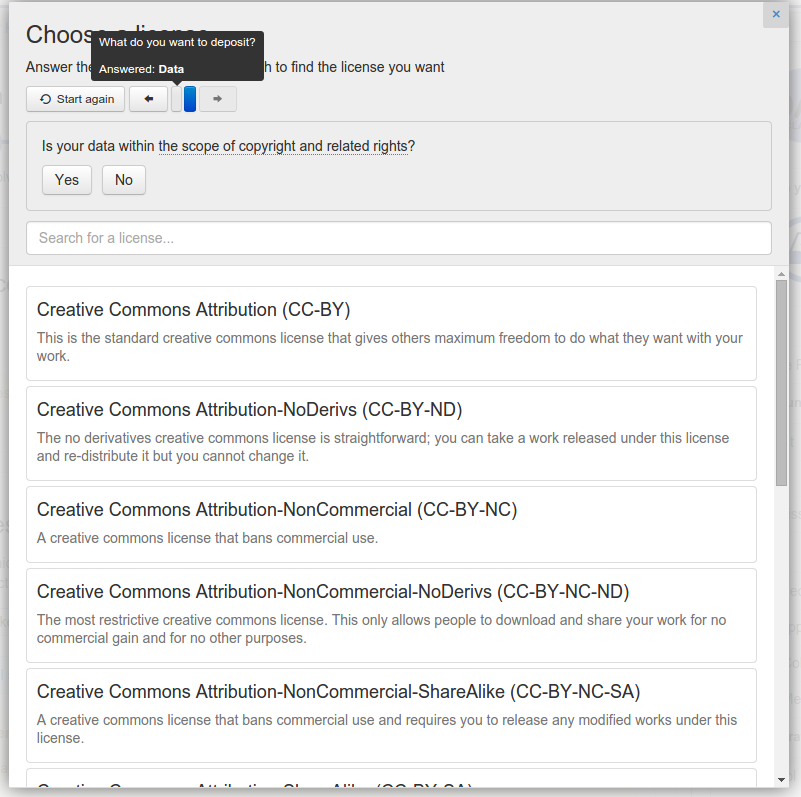 While we prefer open data and open source software, we understand it is not always possible. We can ensure that users must authenticate and sign a license in order to download your data (see Restricted Submissions). If you need more information about the users than the fact that they authenticated via a university (or similar), we can ask for some specific attributes similar to standard web forms. This makes sense mostly for data with "no redistribution" clause in their license.Click Next to continue.